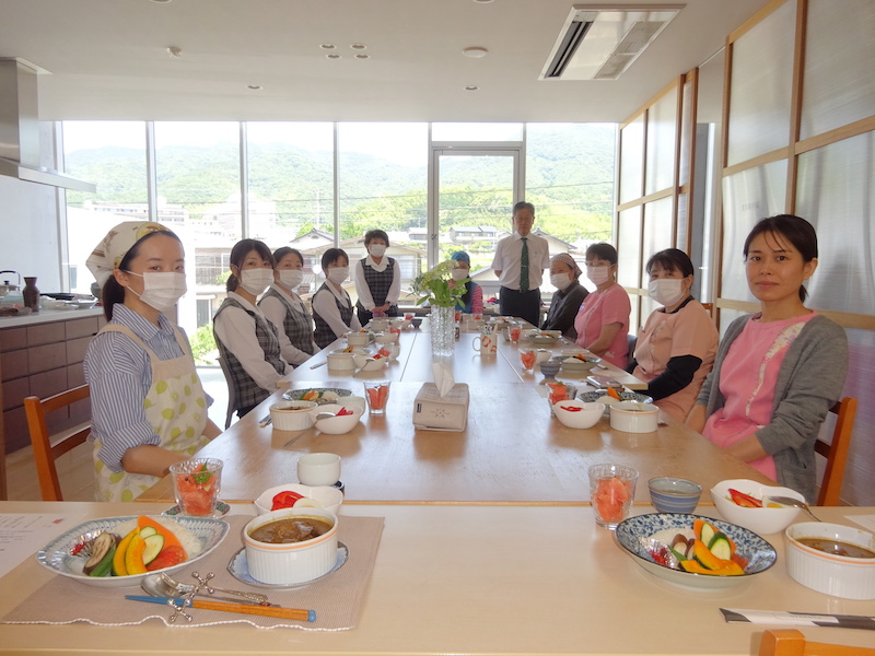 平成26年3月より月2回「まかない」を始め、NHKの「サラメシ」を真似て「クリメシ」と名付けました。令和7年6月5日(木)は「夏野菜のカレーライス」で11名が参加しました。3分間スピーチは矢野栄養士。