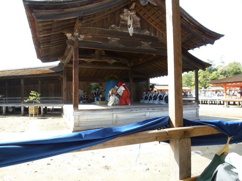 能舞台は国宝です。能舞台と通路の間に桟敷が作られており、そこで座って見るようになっています。お弁当を食べることもできます。厳島神社に拝観料を払えば誰でも見ることができます。宮島を訪れたインバウンドの方たちも見られていました。