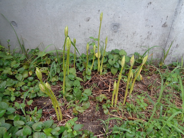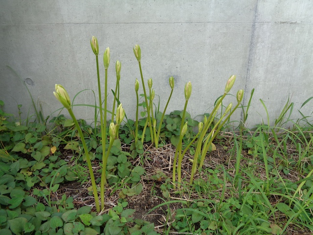 患者さんから頂い白い彼岸花が、例年秋分の日(彼岸)頃には急に茎が地面から出て来て満開になって、患者さんは亡くなりましたが、花が咲くと思いします。今年の秋分の日は令和5年9月23日(火)で、そろそろ芽が出ているかと、いつもの駐車場の一角を見ると、1本だけ芽を出していました。ここ2週間、雨が降って以降、急に朝晩が涼しくなり、目の出る本数や伸びるスピードも早くなってきました。