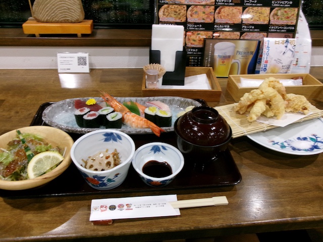夕食は昨年と同じ、日本海沿いにある海鮮のレストラン「海陽王国」に行きました。海を見ながら、「握り寿司と天ぷら御膳」いただきました。帰りにコンビニに寄り、明日の朝食も購入して、ホテルに戻りました。午後9時前には就寝。明日の天気予報は曇りで、雨はなさそうです。
