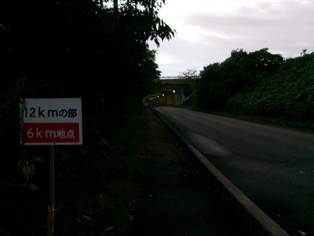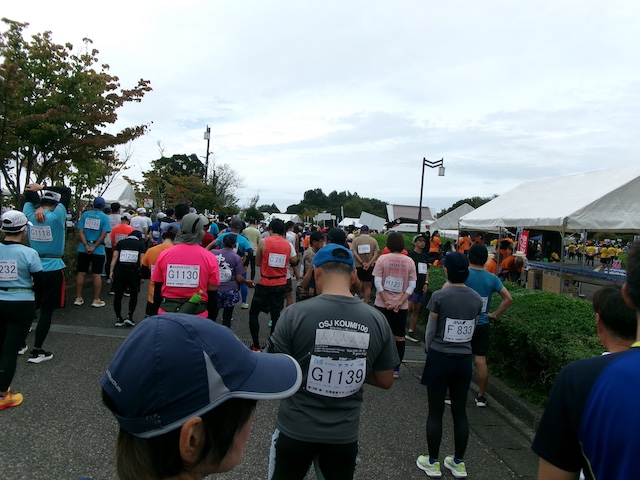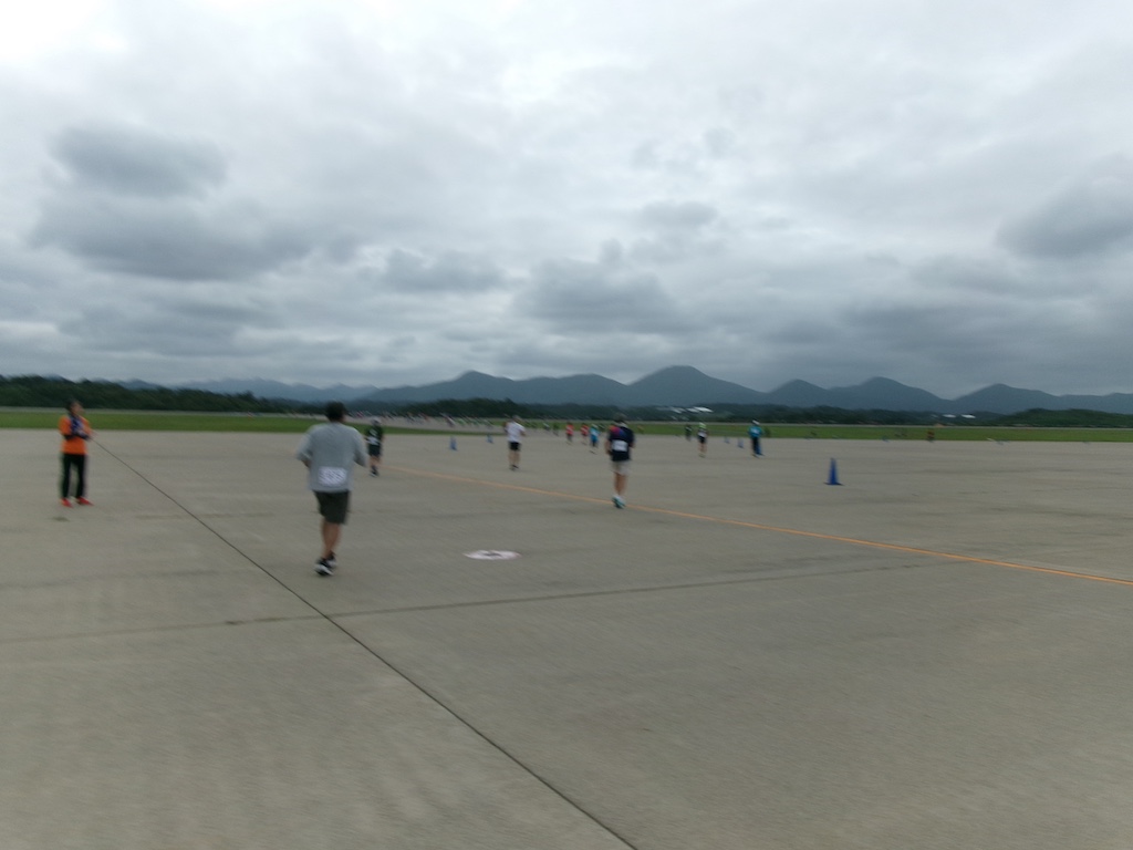 今回、ハーフの関門はゴールを含めて6箇所あり、ゴールが3時間以内、キロ8分30秒のペースです。9月の桜江マラソンが20キロが3時間18分だったので、ハーフ(21.1キロ)だと、関門の制限時間が厳しくなっていました。参加者がハーフが1004人、12キロが704人。ハーフは午後0時スタート、28組あり、19組と後ろの方の組でした。今回はウエブスタートではなく、一斉スタートでした。午前12時スタートで、整列していましたが、石見空港の準備ができていないということでスタートが少しずつ遅れ、結局午前12時37分にスタートしました。