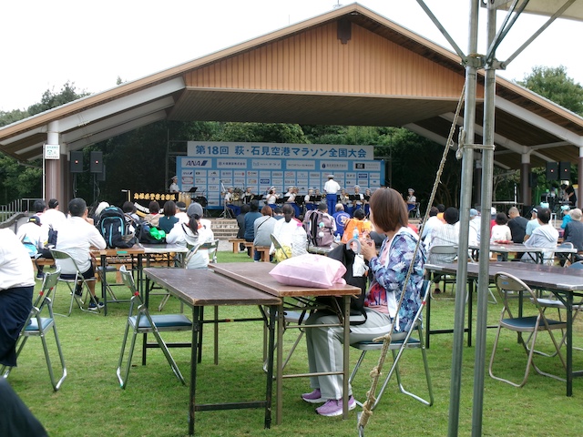 午前10時にホテルをチェックアウト、車はホテルの駐車場に置いて、歩いて会場に向かいました。午前10時すぎ会場に到着、ハーフのスタートまで2時間近くあり、ステージでは午前10時半から30分、昨年は「ANAチーム羽田オーケストラ」による演奏でしたが、今年は島根県警の楽団の演奏でした。昨晩、家内の香川県に住むいとこからメールがあり「参加者名簿に名前を見つけた。明日自分もハーフに出るため益田に向かう」とありました。会場でいとことも出会うことができ、久しぶりに話ができました。音楽を聴きながら、ゆっくりとした時間を過ごすことができました。