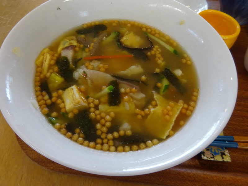 「普段お刺身で食べることが多いので出汁をかけるというのは珍しいなと思いましたが、とても美味しかったです」と感想をいただきました。ここでの出汁は、水に対して昆布1%、かつお節2%の重量で取ります。鍋に水を計量したら、ハサミで切り込みを入れた昆布を加えてから火を付け、沸騰直前まで温めて取り出します。かつお節を入れて沸騰させたら火を止め、ザルで漉して完成です。今回の出汁には一切調味料を使っていません。「たくあんやあられが良いアクセントになっていて、塩味も丁度良かったです」と言われた方も居られました。