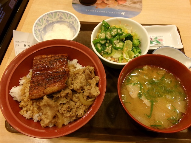 山芋ウナ牛、オクラ野菜サラダ、豚汁