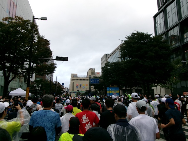 午前5時起床、コンビニで買った朝食を食べて、午前6時半にホテルを外に出てみると、やはり雨が降っており、レインコートを着てチェックアウト。トラックにゴール地点まで手荷物を運んでもらうように荷物を預け、トイレを済ませ、スタートまでまだ50分くらいありました。木の下で雨宿りしながら、スタートブロックの閉鎖前まで時間を過ごしました。スタート前には曇り空ですが、雨は止みました。