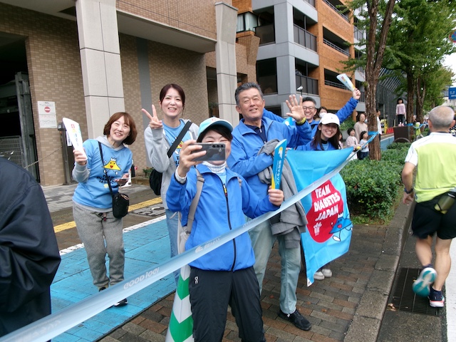 午前8時20分スタート。スタート合図が聞こえず、適当に腕時計のストップウォッチをスタート、最初の1キロ目が7分29秒で、まずまずのペースでした。3キロ地点で福岡TDJの皆さんの応援を受けました。