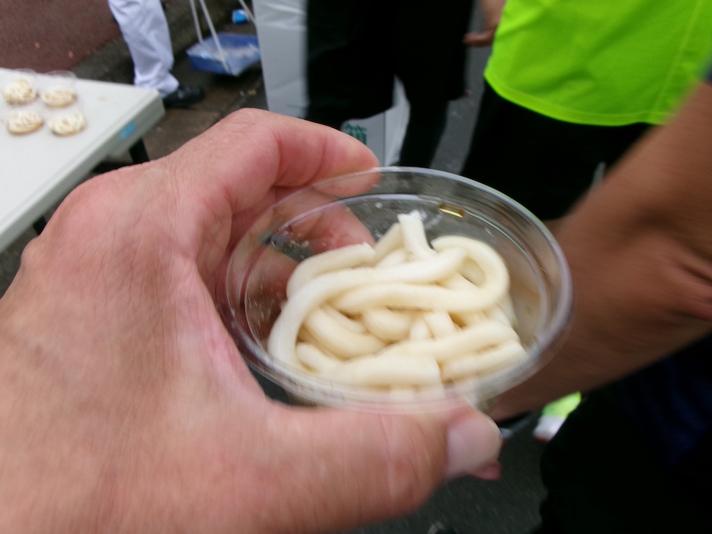 25キロ地点には「牧のうどん」がありました。エイドステーションの食事には福岡の銘菓、トマト、バナナやみかんなど沢山ありました。