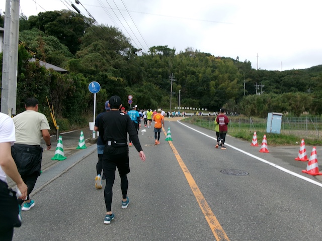 コースは前半はフラットで、後半は海沿いの道が多くアップダウンがあります。今回は制限時間が7時間と長く、なるべくイーブンペースで行けるように心がけることにしました。コースは20キロ前後の九州大学伊都キャッパスあたりが唯一の折り返しのある地点で、TDJの2名のランナーとすれ違いました。