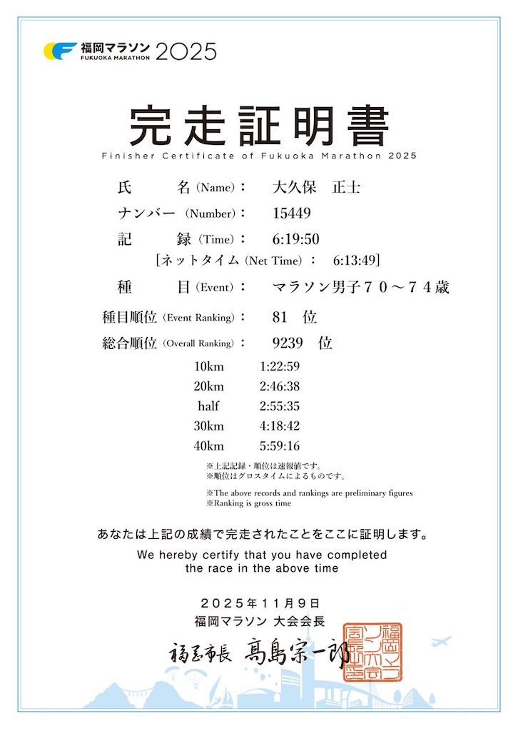 今年も下関海響マラソン(11月2日)と福岡マラソン(11月9日)にエントリーしていました。下関海響マラソンは37キロ地点の関門に引っかかりました。下関海響マラソンは制限時間が6時間、福岡マラソンは7時間(キロ10分で7時間1分)で、関門の制限時間も遅くなり、気分的には少し楽でした。これまでは抽選が外れ、寄付で参加していましたが、今回は抽選に当たりました。