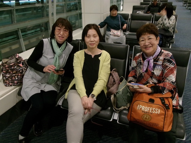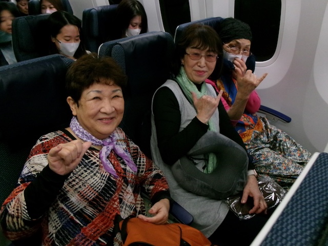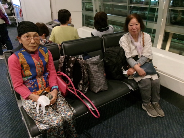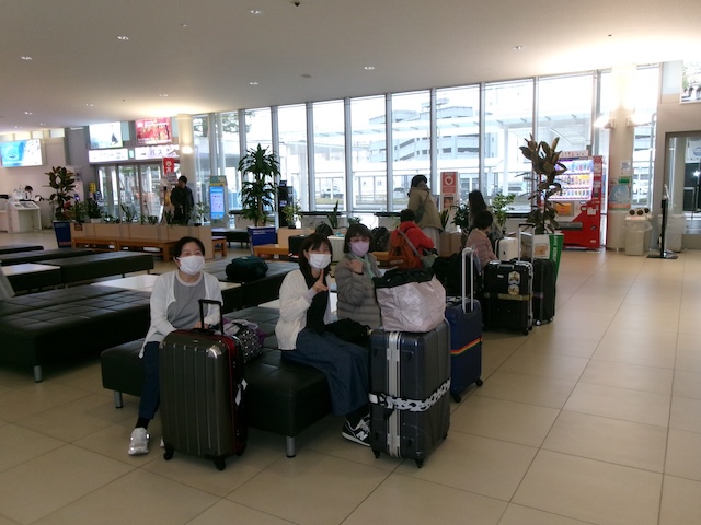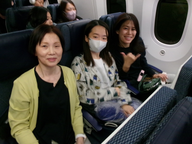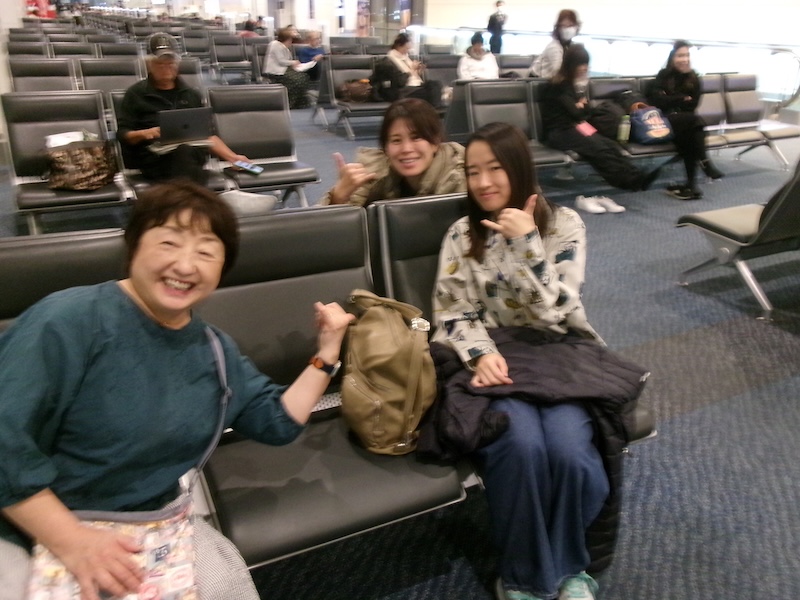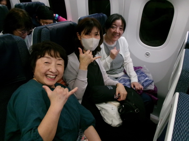 午前中診療をして、午後2時にクリニックに集合。各自の車で岩国空港に向かい、渋滞もなく進み、午後3時には到着しました。午後4時からチェックインし、手荷物預かり、検査を受け、午後5時55分発まで待ちました。全日空で、羽田経由でホノルルに向かい、手荷物はホノルルまで運ばれるので、機内持ち込みだけで移動でき便利でした。岩国空港に飛行機の到着が遅れ、さらに羽田でも着陸時間も混雑で遅れました。