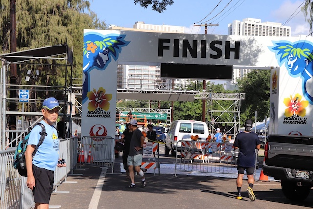 ハワイに着いてすぐ、コンベンションセンターにゼッケンと記念Tシャツをもらいにいきました。会場につくと、その大きさに驚き、本当に10㎞も歩くのだと実感しました。日差しが強いと思い現地でサングラスを購入したのですが、スコールの影響でその出番はなく少し残念でした。初めてのホノルルマラソンの良い記念になりました。