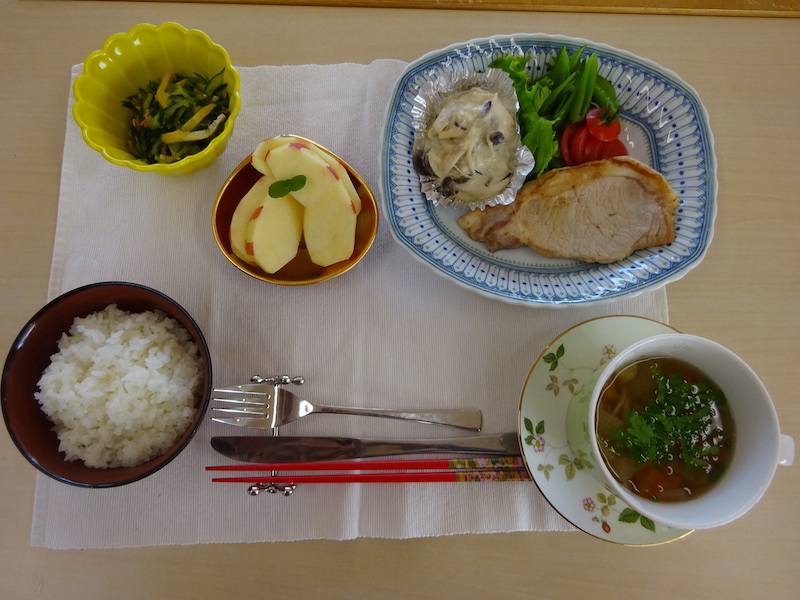 平成26年3月より月2回「まかない」を始めました。NHKの「サラメシ」を真似て「クリメシ」と名付けました。令和8年1月8日(木)は「ポークソテーヨーグルトソース」で12名が参加しました。3分間スピーチは矢野栄養士。