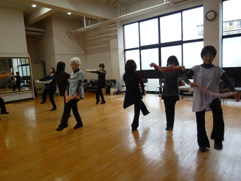 それぞれのダンスに合わせて、メンバーの立ち位置が決まります。私は最前列に決まって、ダンスを間違わなければいいがとドキドキしました。インストラクターの方も「指先はしっかり伸ばす」「列はまっすぐに」など指導にも熱が入ります。ダンスも皆がそろってできるようになると、衣装合わせです。インストラクターが曲にあった衣装をそろえます。ダンスのイメージに合わなければ、別の衣装で踊ります。それで、衣装が決まります。本番前に、会場のアクティブやないでリハーサルです。この時に舞台での立ち位置が決まります。