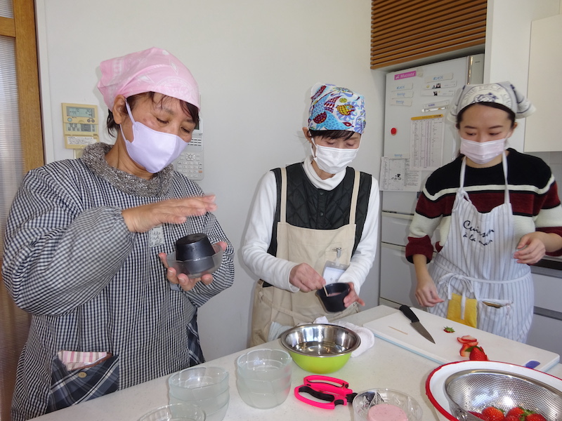 “いちごのババロア”は、いちごは洗ってヘタを取り水気を切ります。いちごとパルスイートをミキサーにかけます。ゼラチンはふやかし、電子レンジで溶かします。いちごのピューレをボウルに入れ、溶かしたゼラチンを加えてよく混ぜます。生クリームと牛乳も入れて混ぜたら器に注ぎ、冷凍庫で40分冷やし固めます。型から抜き、いちごと椿の葉を飾りました。