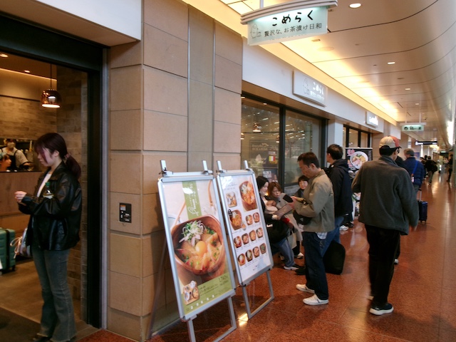 予定通り午前9時に離陸し、午前10時半過ぎに到着、到着ロビーには午前10時40分になり、あらかじめ午前11時55分発東京ビッグサイト行きリムジンバスを予約していました。昨年と同じく早めの昼ご飯にし、空港内のお茶漬けの店「こめらく」で、おひつごはんといって、丼を食べて、その後残りに出汁をかけて、お茶漬けにして食べました。予定通り、7番乗り場から出発。