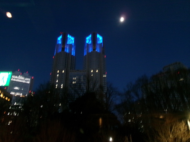 ホテルのレストランから東京都庁のライトアップを眺める