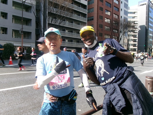 午前5時起床、午前5時45分から部屋で朝食。今回はホテルが集合場所の直ぐ前なので、午前6時半前に集合会場を下見に行って見ることにしました。ホテルの朝食会場の前は長い列になっており、コンビニの朝食で正解でした。今日の予想最高気温が18度で、暑くなりそうですが、朝はまだ肌寒く、生んどブレーカーも来て、応援ポイントで脱いで渡すことにしました。アームカバー、手袋、ランニングポンチョ、うん度ブレーカーを着て、午前7時半過ぎにホテルを出て、「入場ゲート3」の場所がよく分からず、ウロウロしてなんとか手荷物チェックを受け、荷物をトラックに預け、後はスタートを待つだけです。