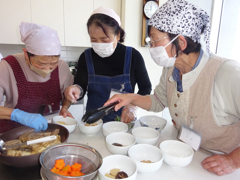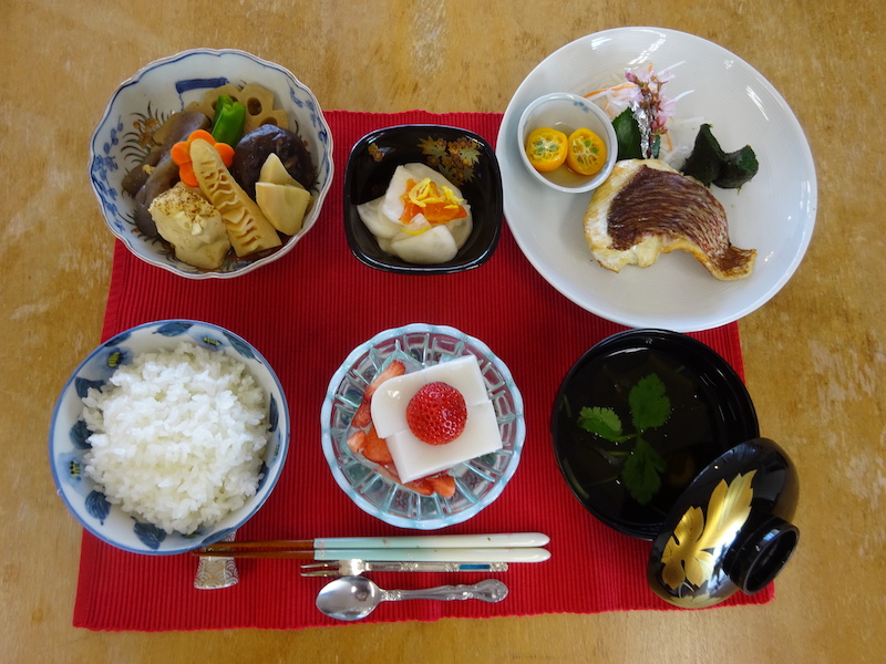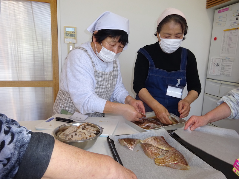 今回は参加者の方が金柑を持ってきてくださったので、半分に切った金柑に、ラカントと少量のお水を加え、電子レンジで3分加熱したものも、鯛のお皿に添えていただきました。優しい甘みと少しの苦味が合わさってとても美味しかったです。また、柚子の果汁を混ぜてみた柿なますも、いつもより香りが立って好評でした。「お昼から鯛をいただけるなんて贅沢だね」「お腹いっぱいになりました」とみなさんおっしゃってくださいました。