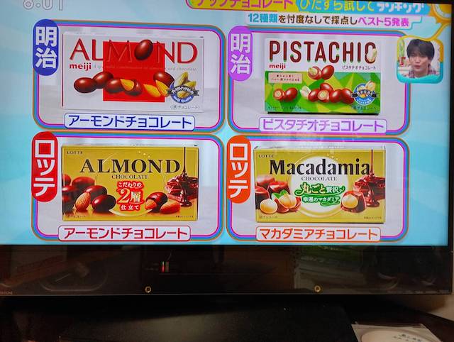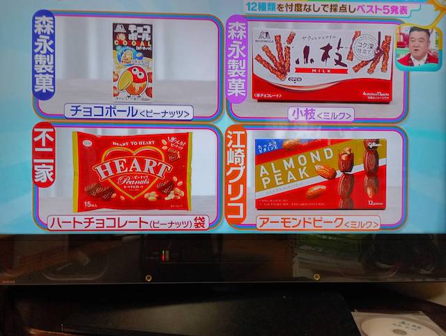 バレンタインデーは、1932年モロゾフが提案したイベントで本命チョコ・友チョコ・義理チョコ・ご褒美チョコの文化を広めました。番組の内容は、12種類のチョコレートひたすら食べて順位決めるというものです。チョコレートの種類は、明治のアーモンドチョコ・ピスタチオチョコ、ロッテのアーモンドチョコ・マカデミアチョコ、森永製菓のチョコボール・小枝、不二家のハートチョコ、江崎グリコのアーモンドチョコ、無印良品のピーナッツチョコ、ローソンのアーモンドチョコ、ファミリーマートの深煎りピーナッツチョコ、でん六の146g小袋ロカボナッツチョコです。