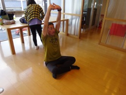毎週火曜日の午後2時から45分間、音楽に合わせてエアロビクスを行います。午後3時からは膝や足首の問題があり、あまり激しい運動の出来ない方のために椅子にすわってやる体操教室を30分程度行っています。